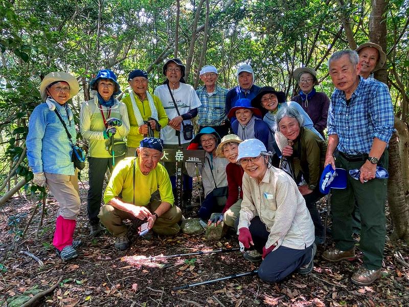 11時18分大岳(286m)到着。別の山岳会の頂上標識あり、Aさん曰く“6ミリの高かステンレスボルトば使うとるばい!”。