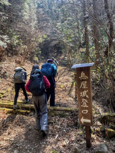 城山までは「急登あり」という看板が出ていて、気を引き締めて歩く。なるほど急登、だが足元は歩き易い土の道だし、地元の人達が、木の名前や「鳥屋城址まであと300mです」というような標識を立てていてく