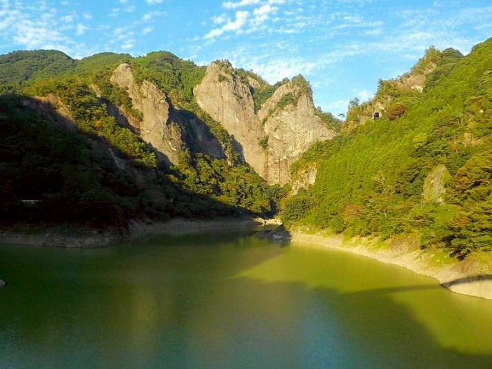 天気も良く、岩場から眺める景色は絶景、日向神ダムの水面と周辺の岸壁とのコントラストが抜群だ。