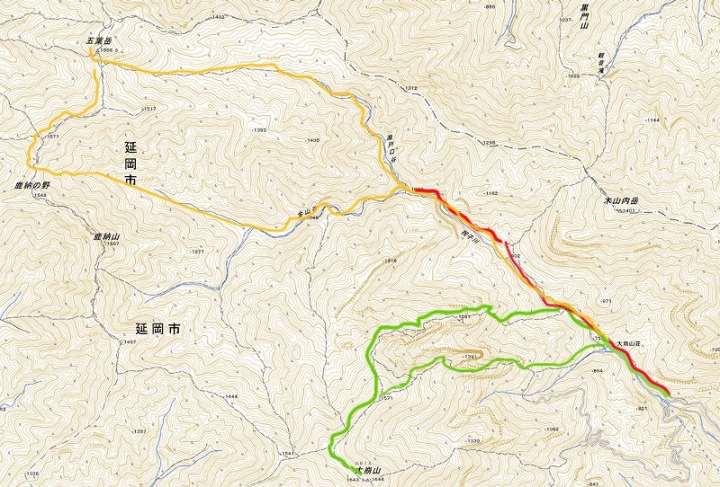 12/28 吐野6:20~8:10 1150m地点~9:10 1300m地点~10:44五葉岳~11:20お姫山~12:00金山谷下降点~12:52 1170m地点~13:40中瀬松谷吐合(金山谷吐合)~14:25もちだ谷分岐(三里河原)~15:03吐野~17:50大崩山荘